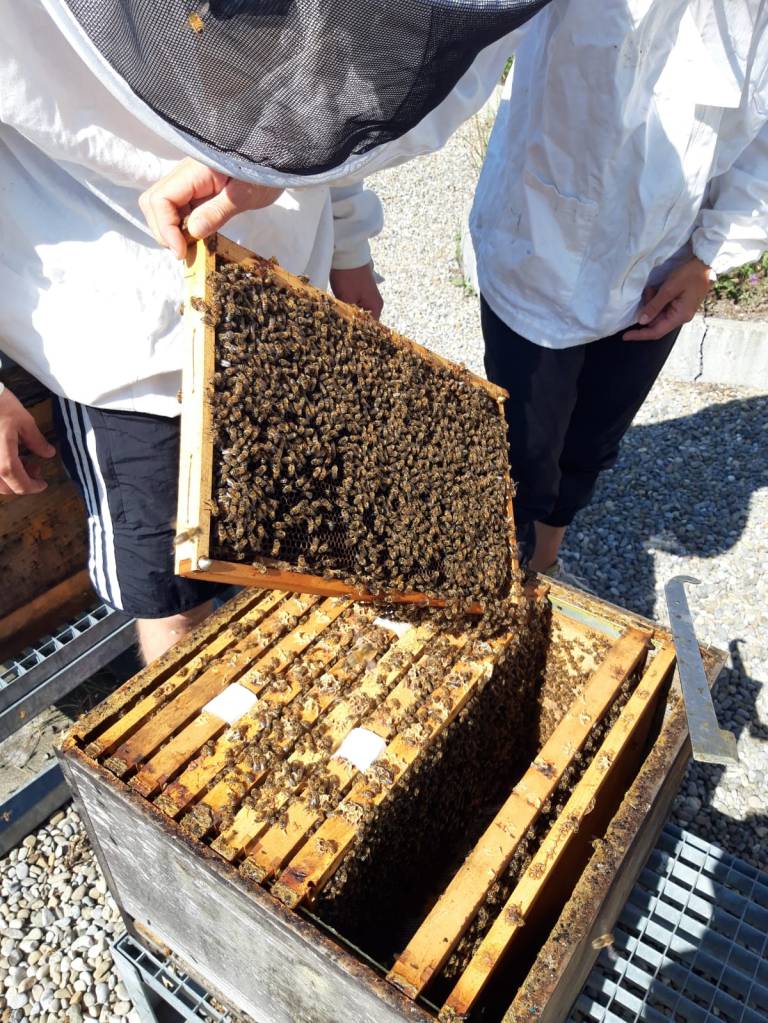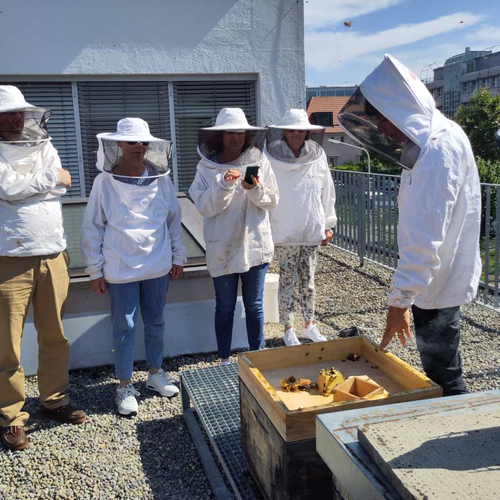 Nach gemeinsamer Besammlung auf dem Dach der Hausamann AG, 8047 Zürich, wurden wir in die Kunst der Imkerei eingeweiht. Alle waren beeindruckt über die innovative Zürcher Imkerei. Die Bienenvölker sind auf ungenutzten Flachdächern stationiert – mit bester Aussicht auf die Stadt Zürich. Mit den angebotenen Workshops und Kursen, leistet Wabe3 einen Beitrag zur Naturvielfalt im urbanen Raum und kann gleichzeitig die Faszination der Bienen an die Öffentlichkeit tragen.